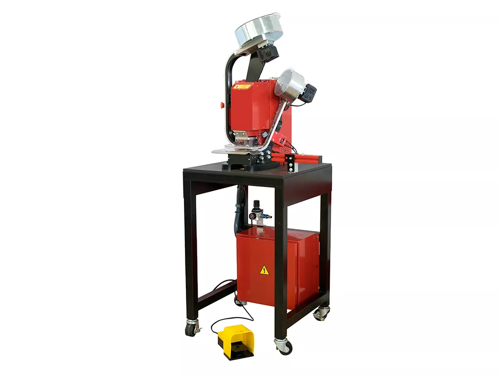 High-performing automatic self-perforating punching machine with foot pedal for PVC banners and textiles for clear plastic eyelets (up to 50 eyelets/min). Equipped with support stand on reinforced wheels. For high-medium volumes users.