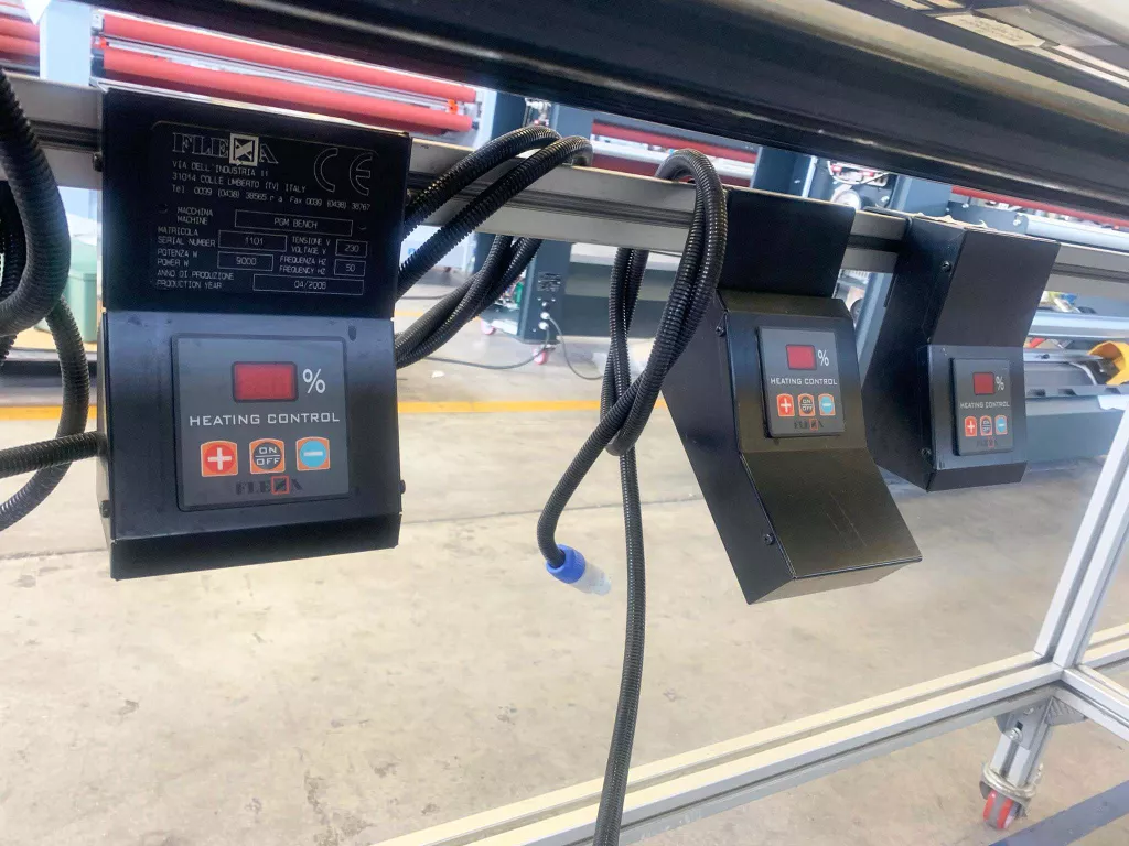 Banco usato completo di 9 attrezzature per la piegatura di lastre di materiale termoplastico (spessore da 1 a 10 mm).