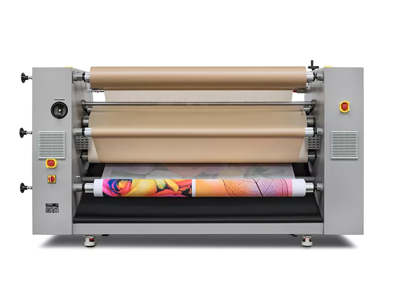 Calandra con cilindro riscaldato a olio progettata per il trasferimento termico da carta sublimatica a tessuto e per il fissaggio di inchiostro stampato direttamente su tessuto.