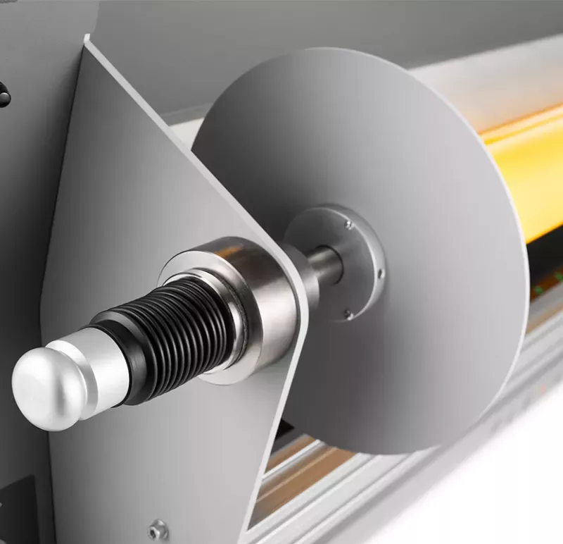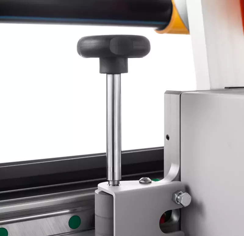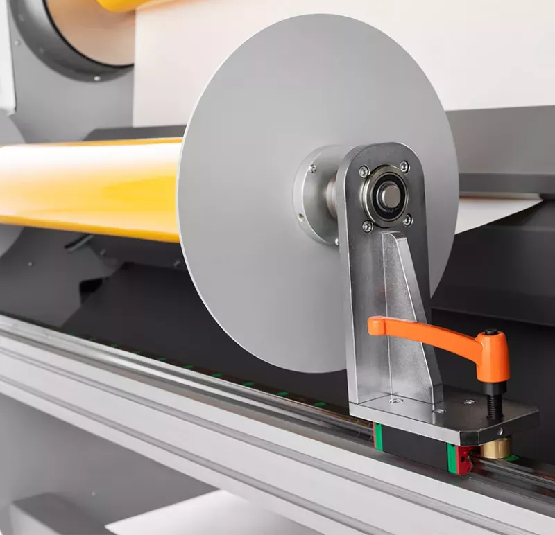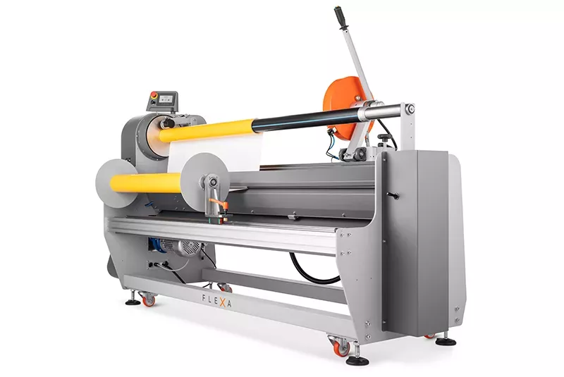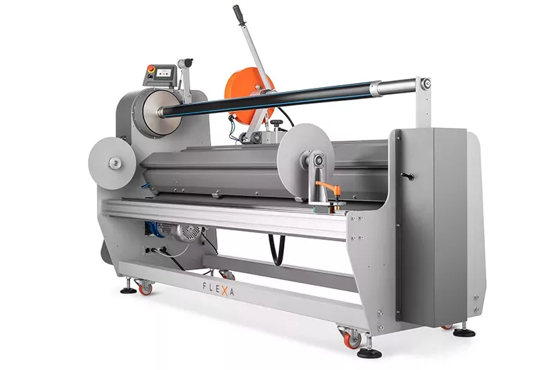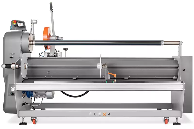 Tagliarotoli professionale heavy-duty per converter. Permette di tagliare e riavvolgere rotoli di diversi materiali in modo estremamente semplice e preciso.