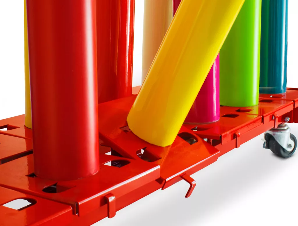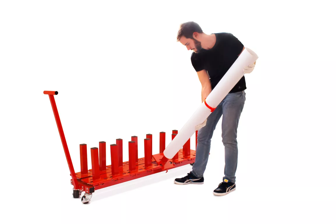 Portarotoli verticale con capacità di stoccaggio fino a 16 bobine.